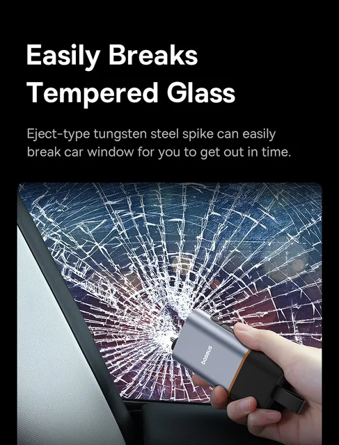 عند الضغط على النافذه يخرج المسمار الفولاذي ويقوم بكسر النافذه بسهولة وسرعة ، مما يوفر لك طريقة للخروج من سيارتك في حالات الطوارئ.